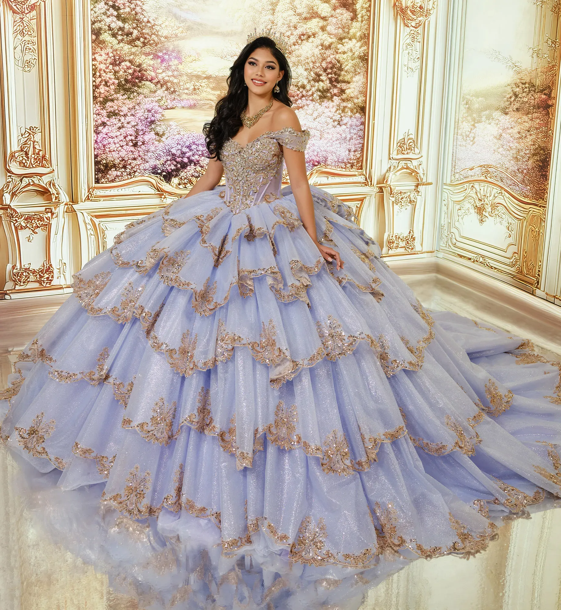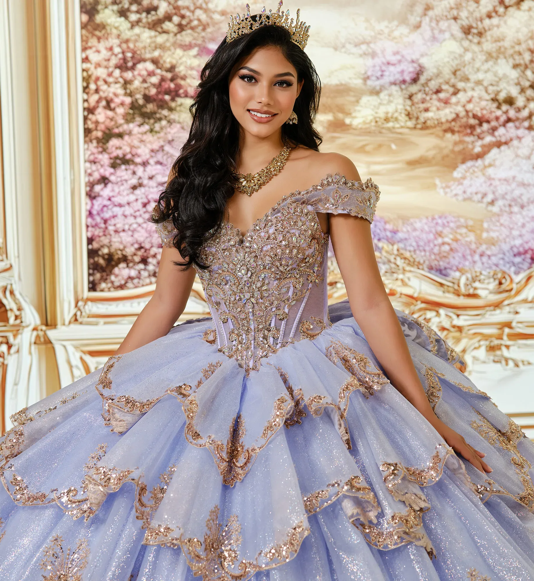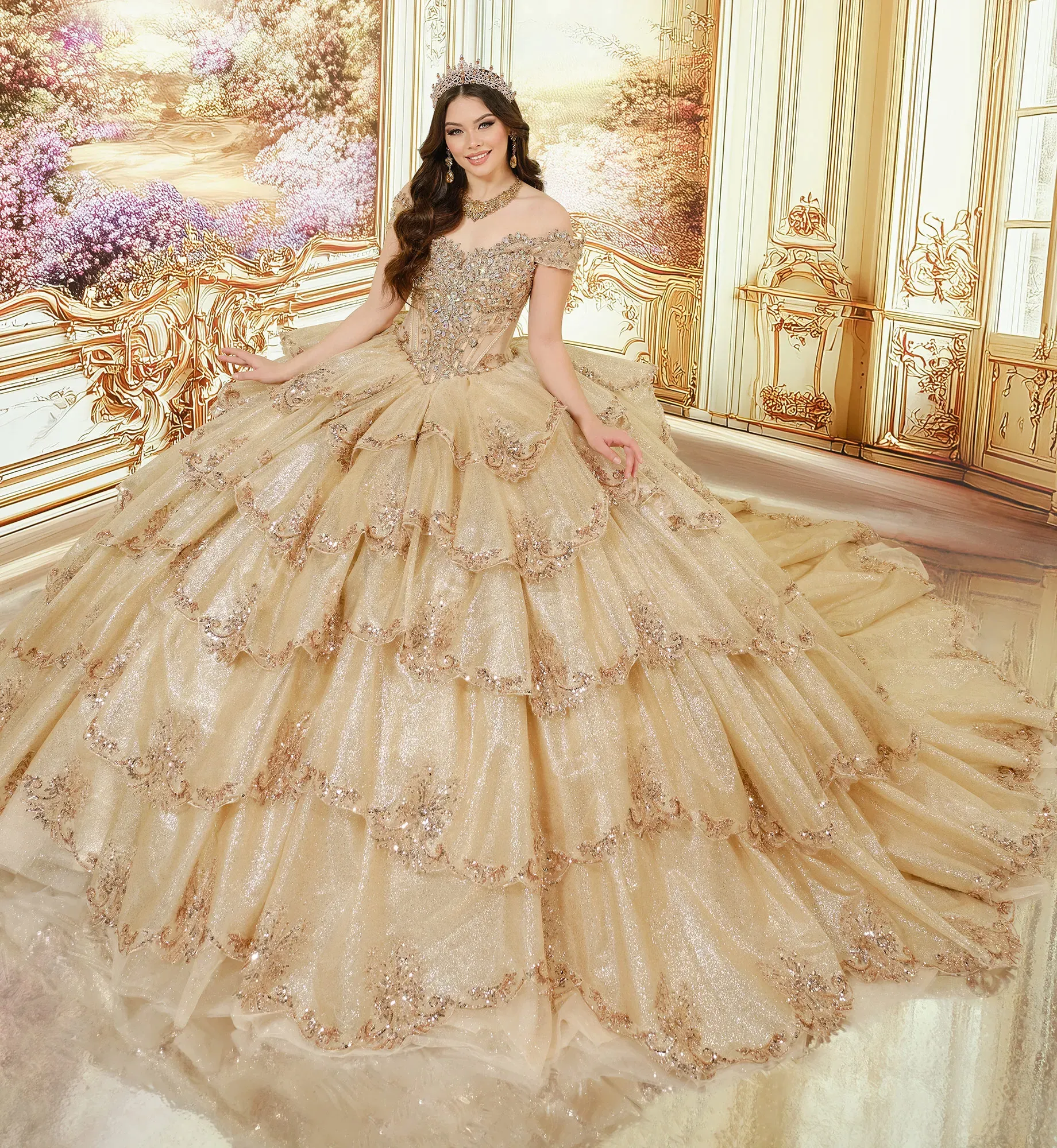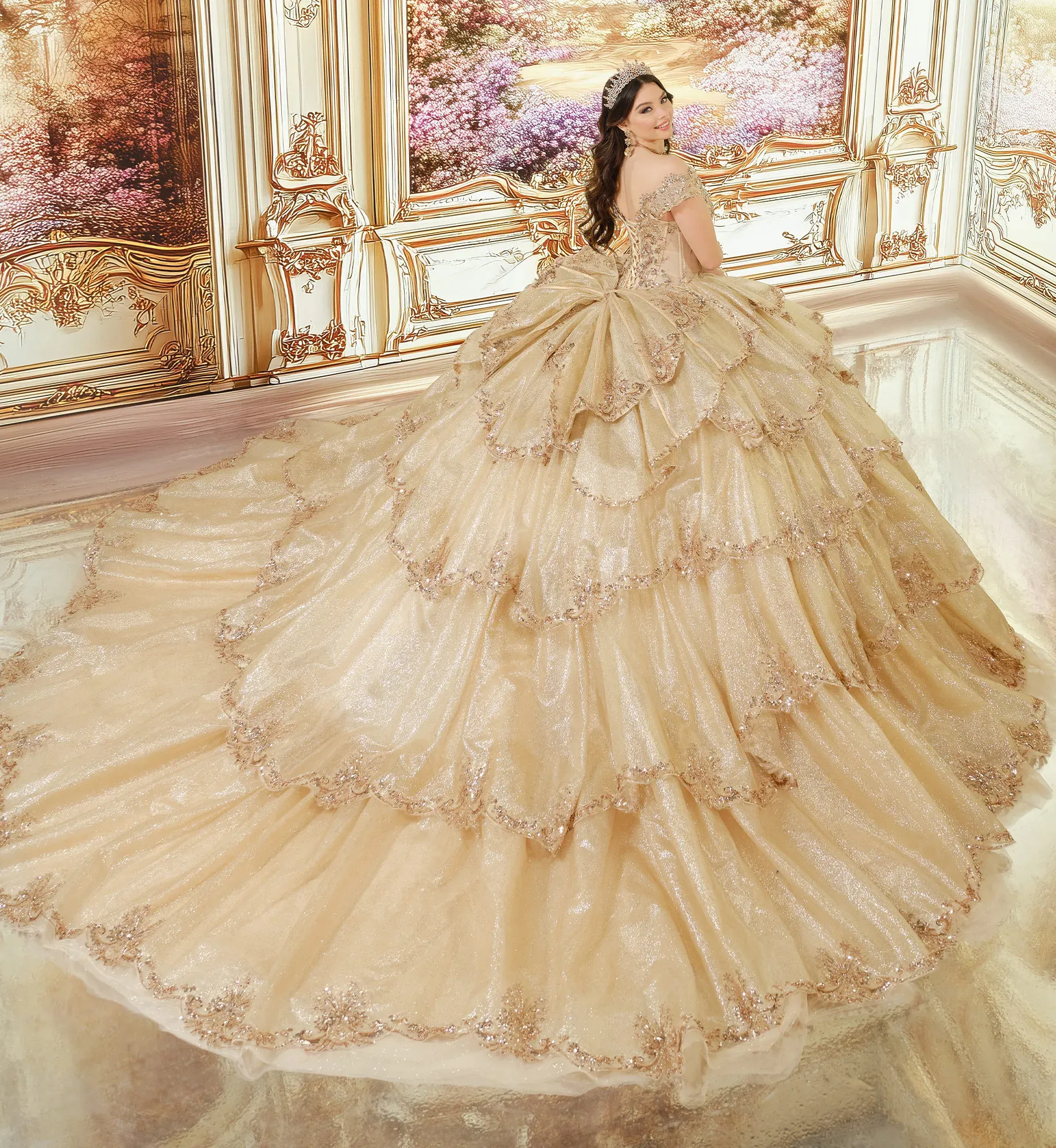 Glitter tulle unfurls into a sweetheart ball gown, adorned with metallic lace appliqués, beading, and sequins that dance in the light. Detachable front collar, capelet, and pockets reveal her timeless enchantment.