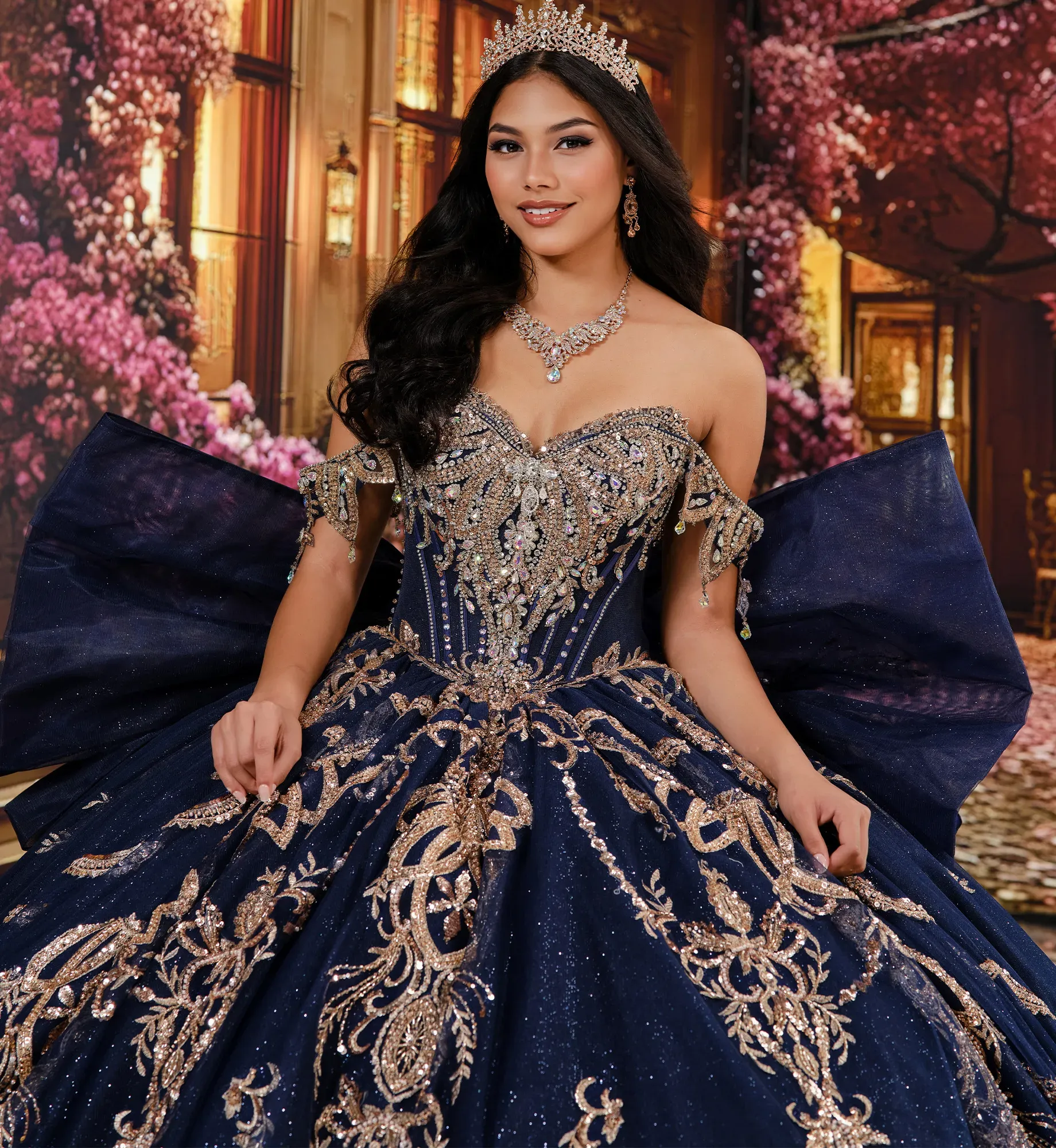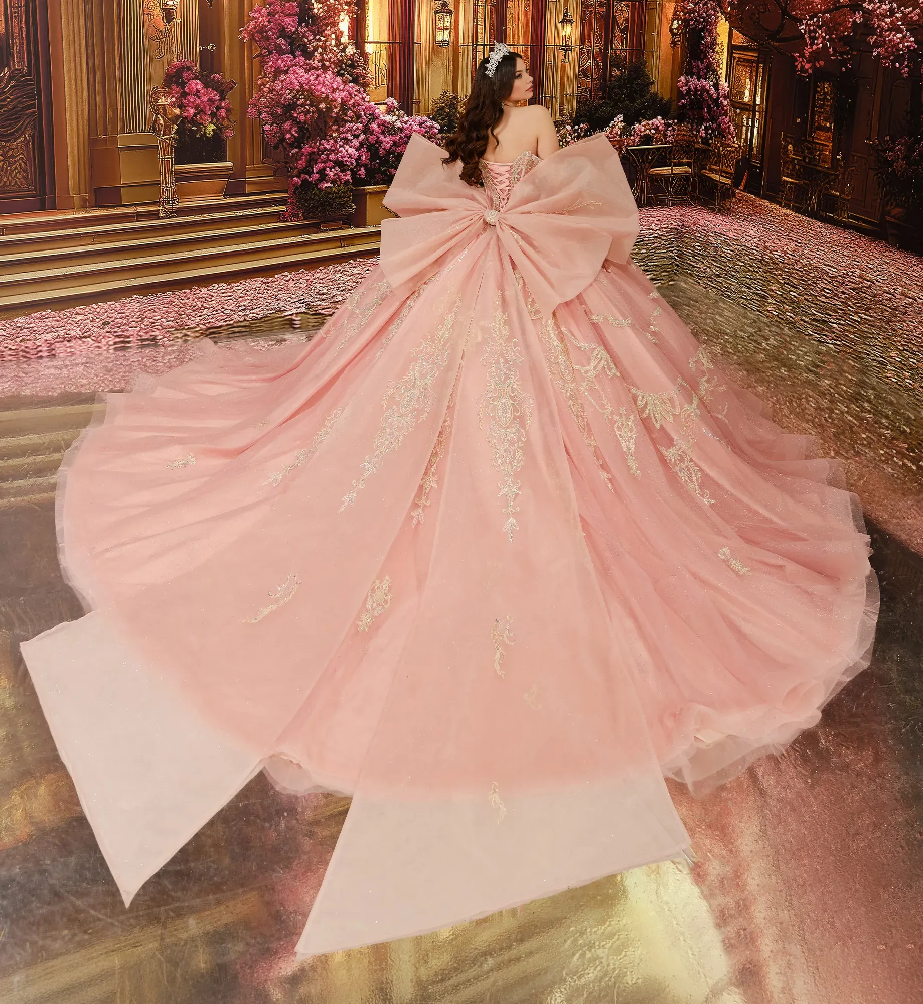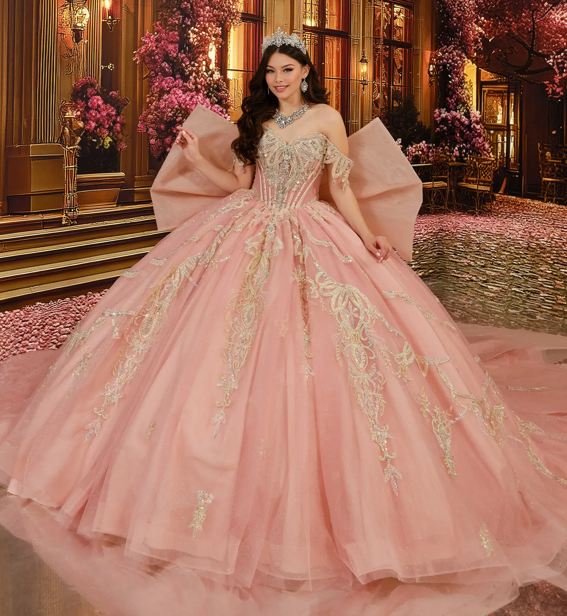 This oversized bow is the drama! This sweetheart quinceañera gown commands the spotlight, featuring layers of glitter tulle, metallic lace appliqué, beading, sequins, and stone accents. It features pockets, detachable off-the-shoulder straps, bow tails, a brooch, a capelet, and a back modesty panel.