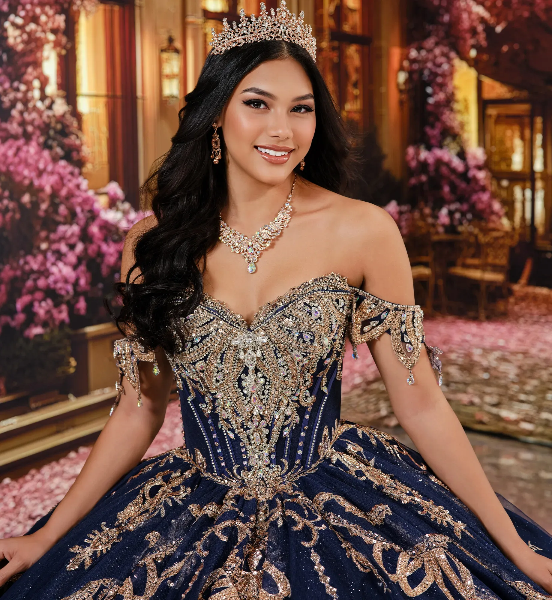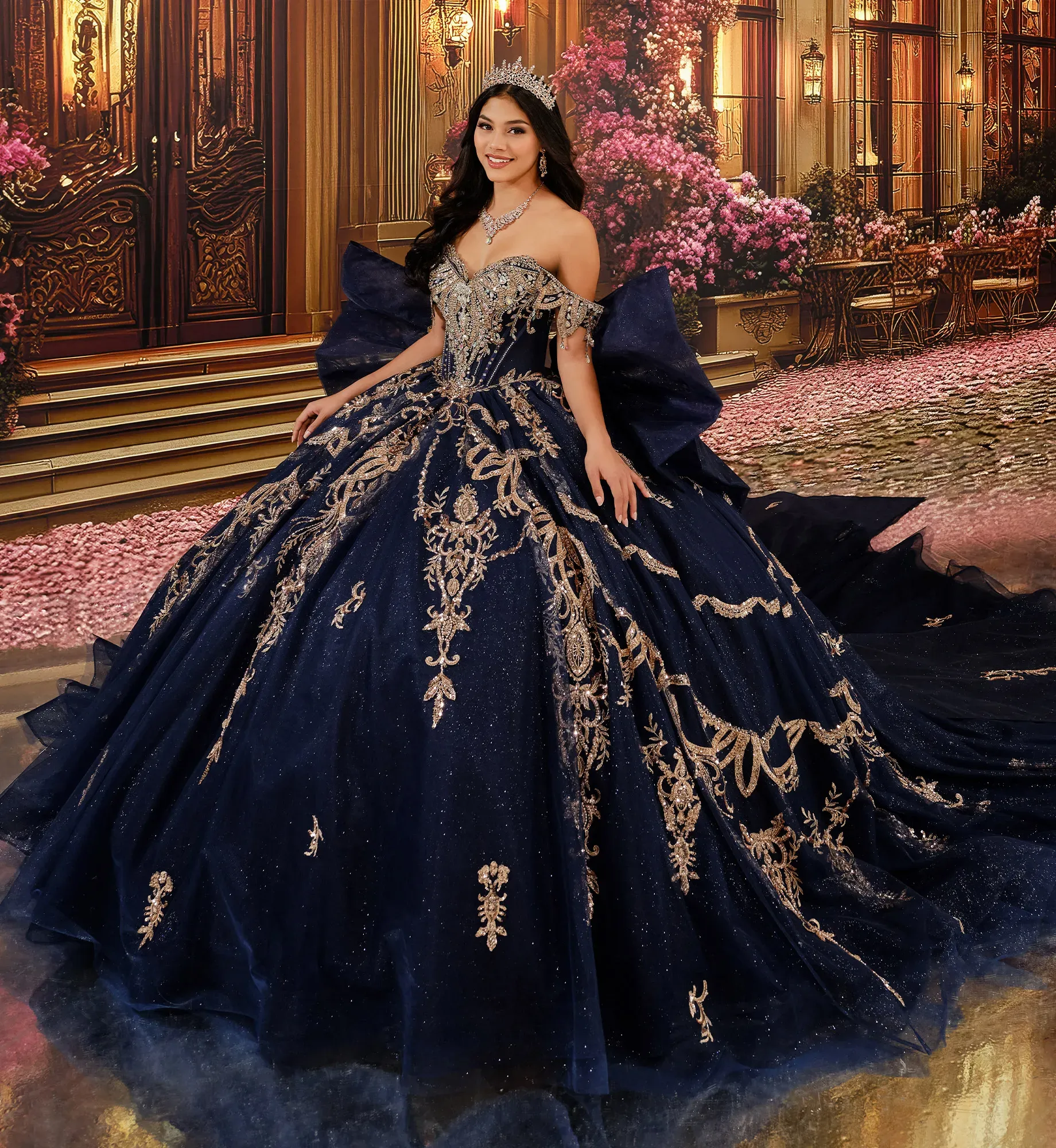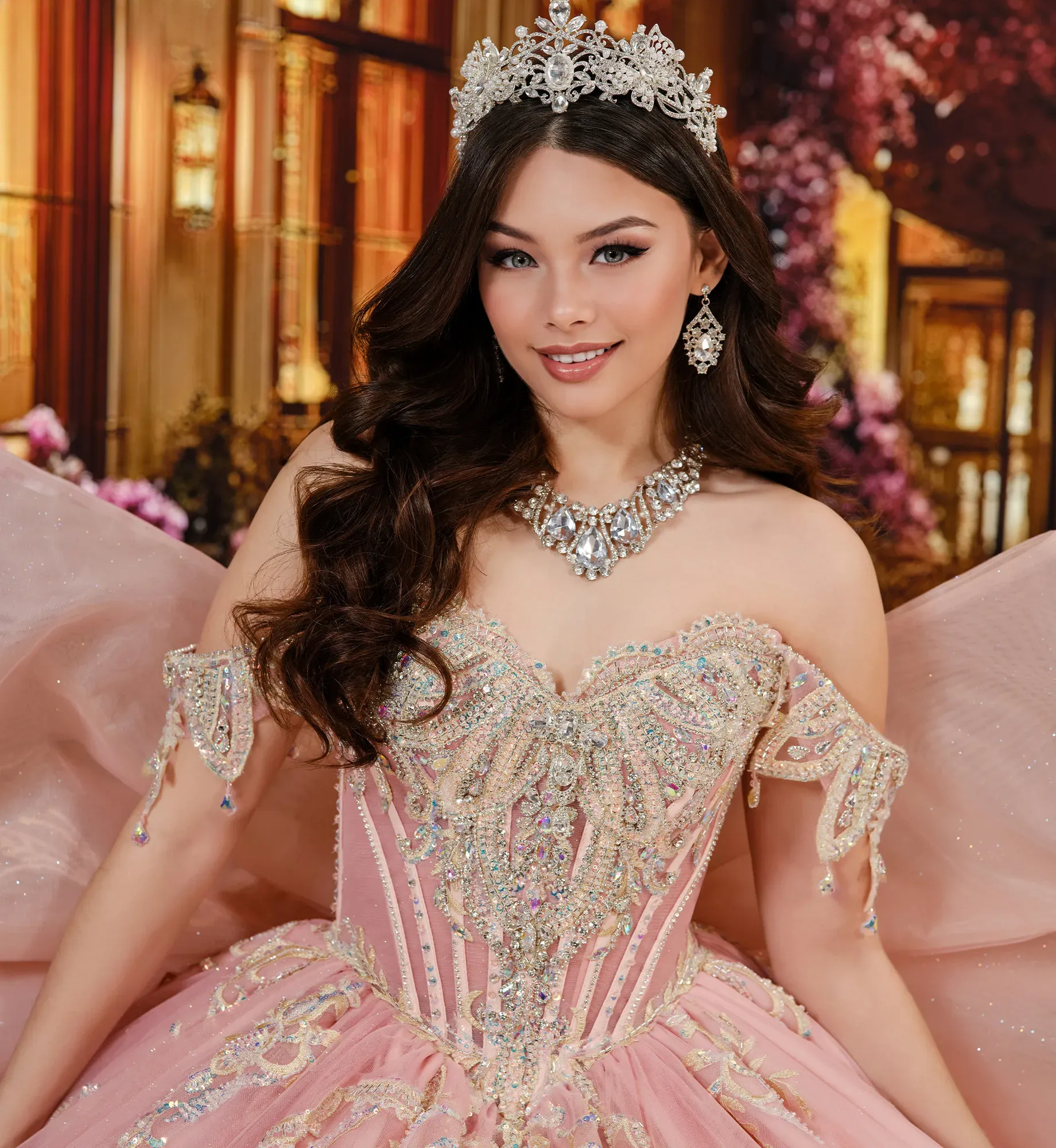 This oversized bow is the drama! This sweetheart quinceañera gown commands the spotlight, featuring layers of glitter tulle, metallic lace appliqué, beading, sequins, and stone accents. It features pockets, detachable off-the-shoulder straps, bow tails, a brooch, a capelet, and a back modesty panel.