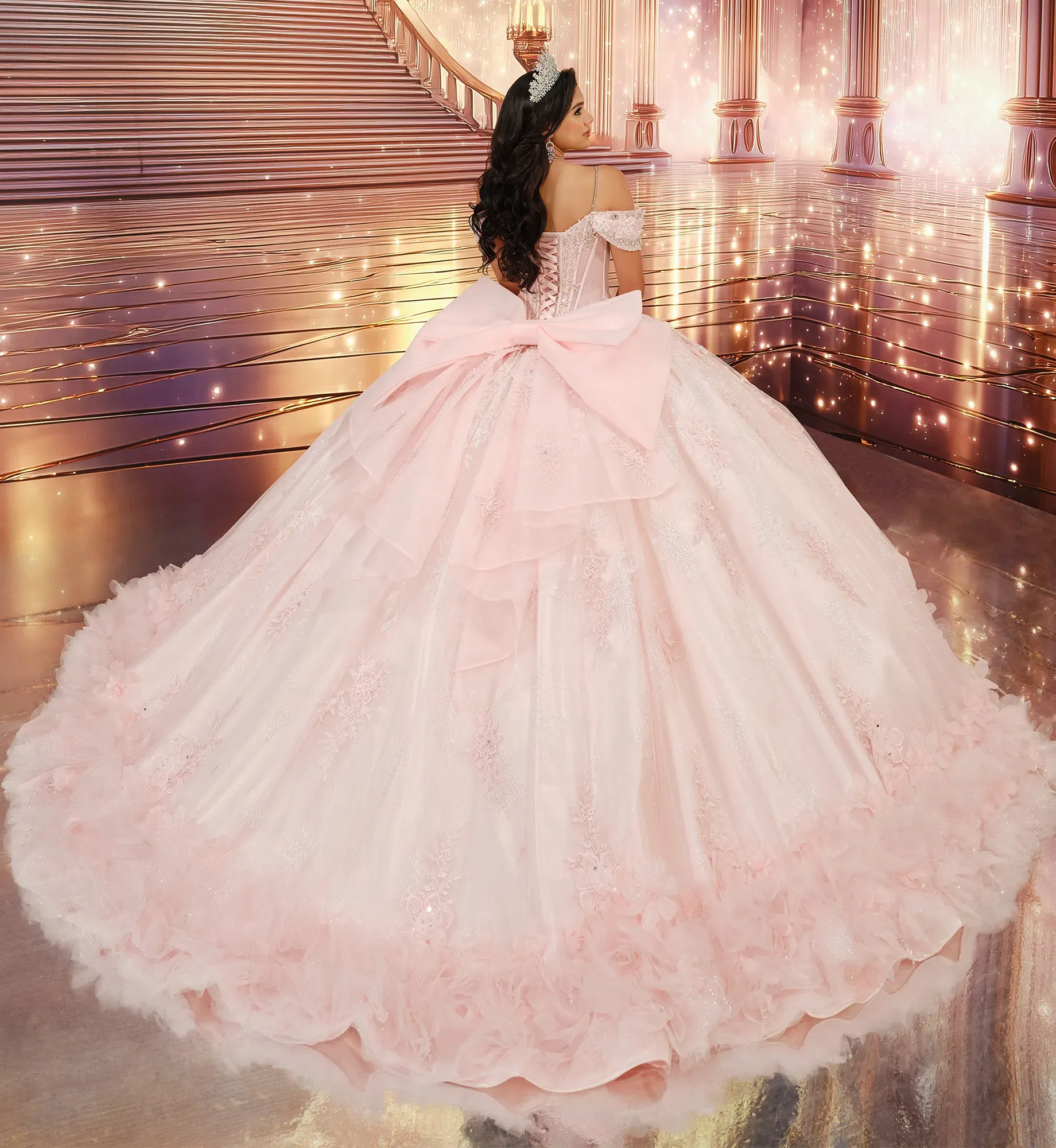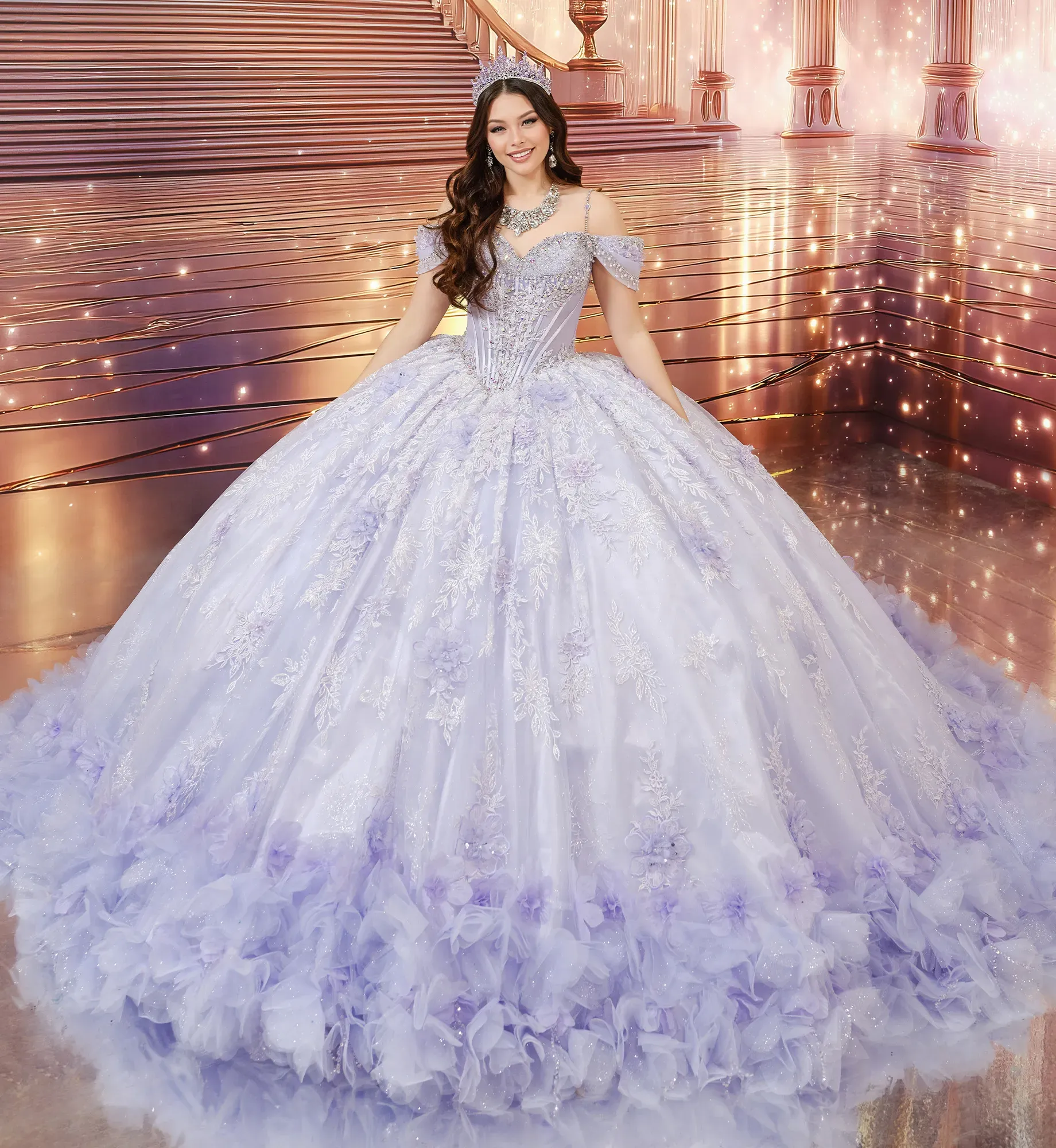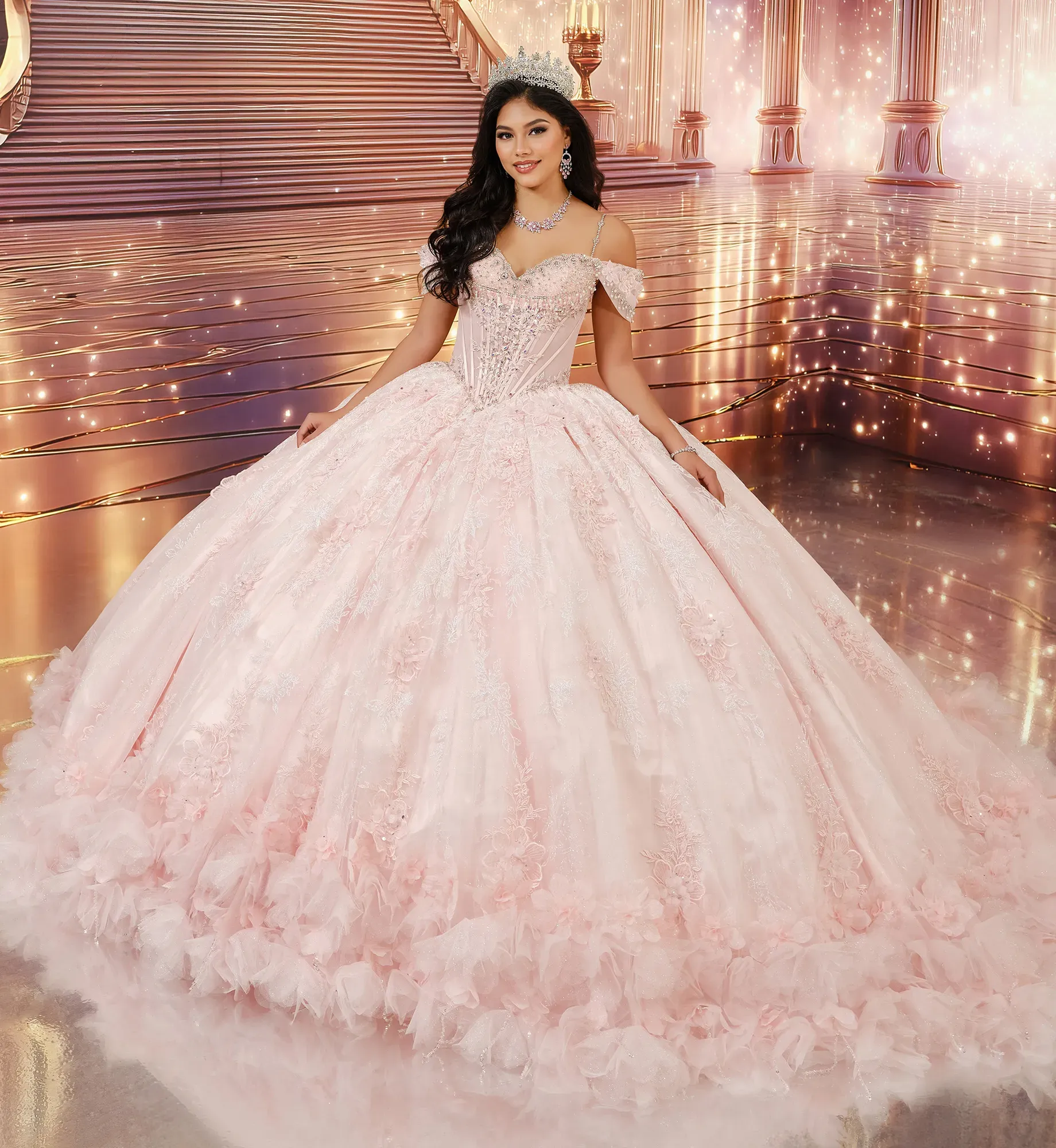 Three-dimensional organza flowers bloom dramatically at the skirt's base on this sweetheart quinceañera gown, set against cracked ice on glitter tulle, lace appliqués, beading, sequins, and stone accents. It features pockets, detachable back bow, jeweled shoulder straps, off-the-shoulder straps, capelet, and back modesty panel.