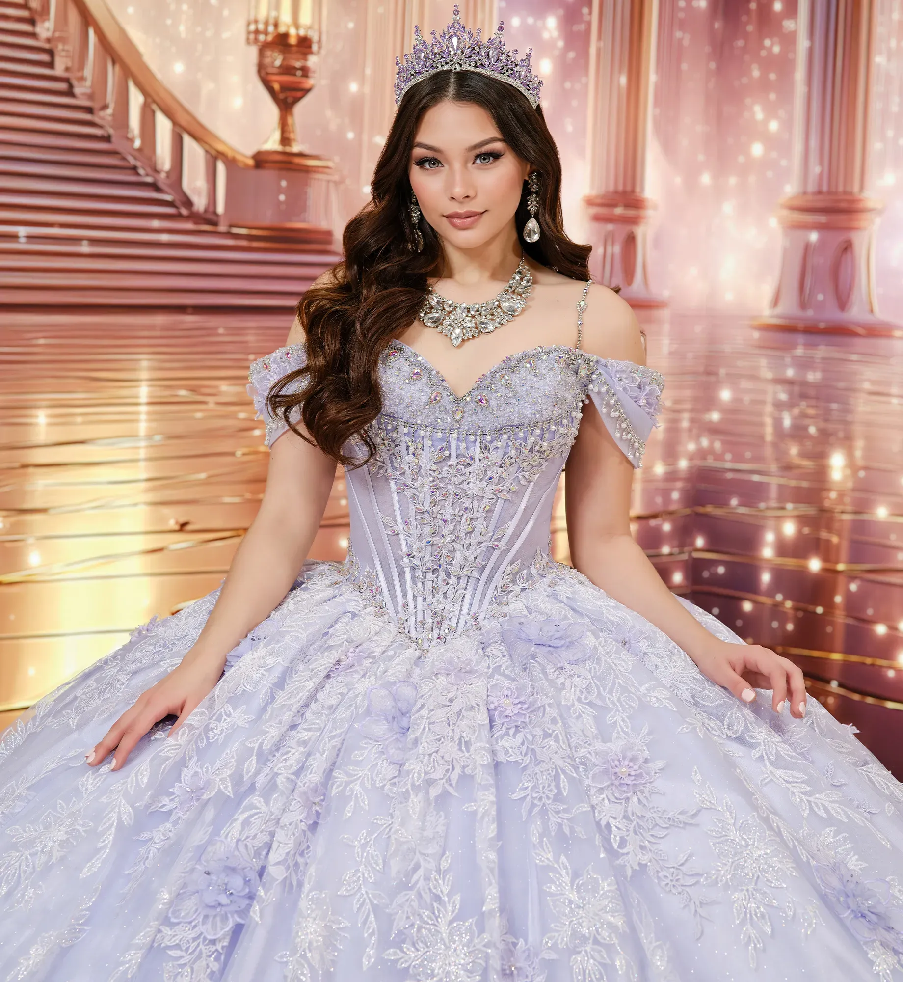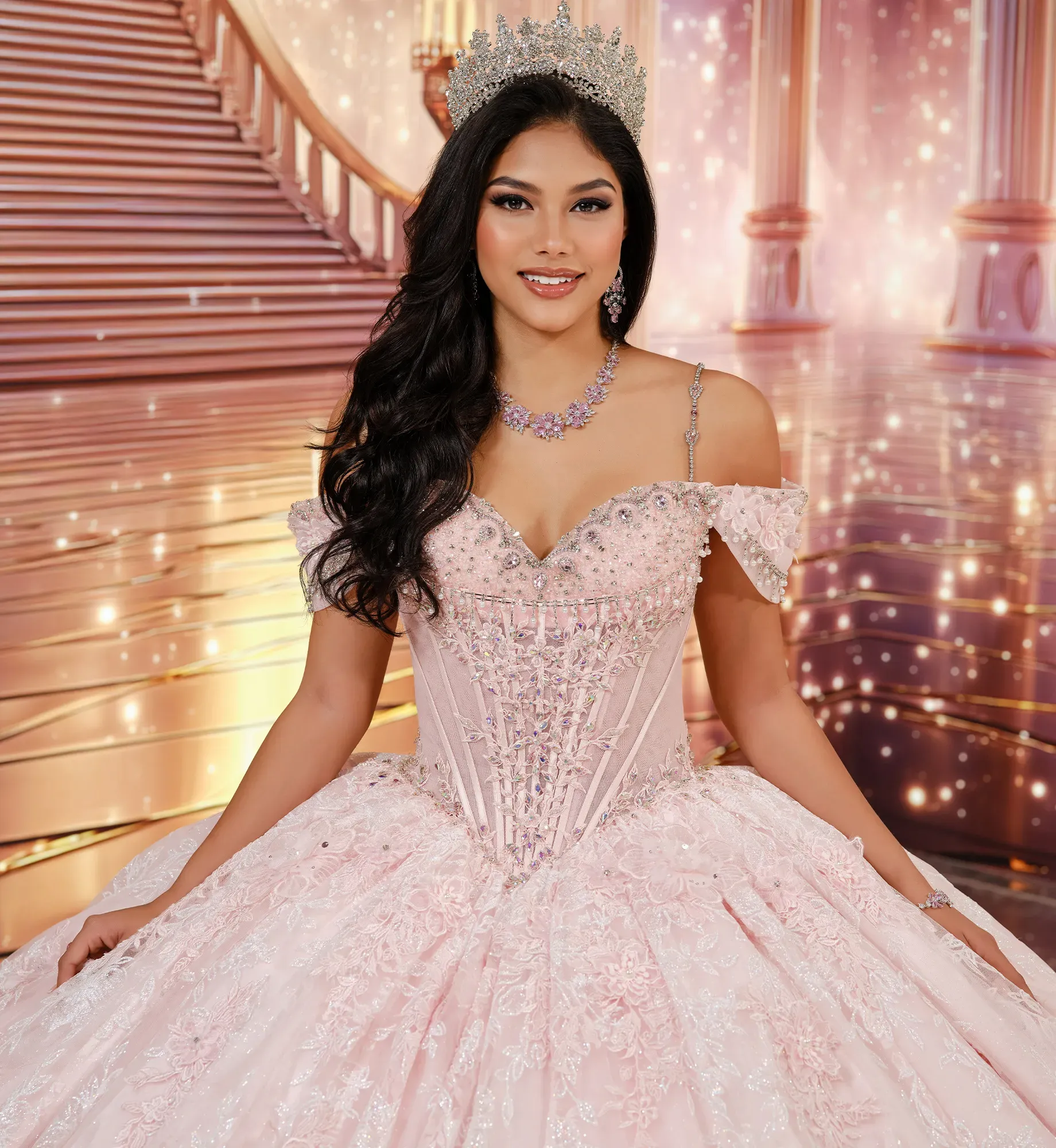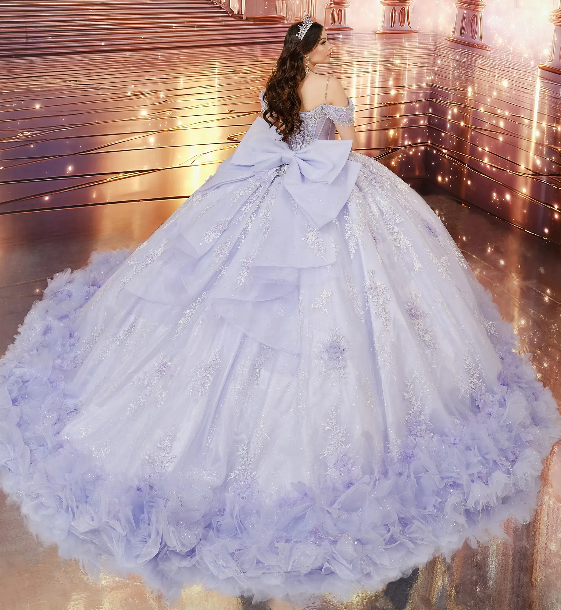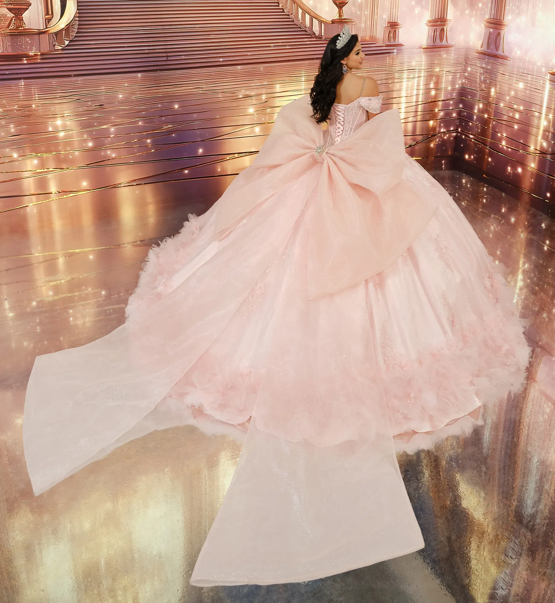 Three-dimensional organza flowers bloom dramatically at the skirt's base on this sweetheart quinceañera gown, set against cracked ice on glitter tulle, lace appliqués, beading, sequins, and stone accents. It features pockets, detachable back bow, jeweled shoulder straps, off-the-shoulder straps, capelet, and back modesty panel.