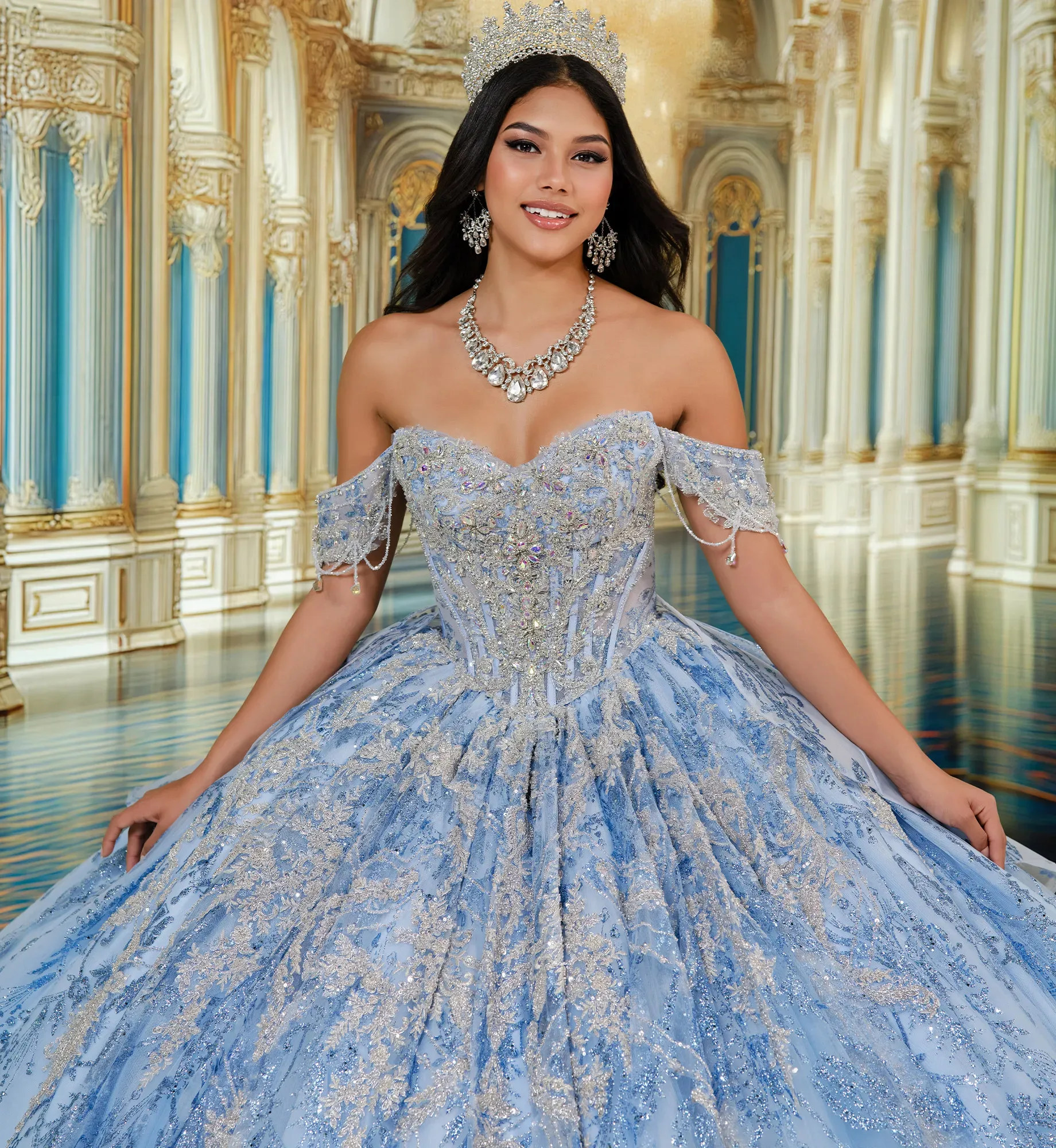 Shine all night long in this gorgeous ballgown. Boning sculpts the bodice to perfection, while the extra-long train sweeps dramatically behind, enhanced by cracked ice, lace appliqués, an oversized back bow, and stone accents. It features pockets, detachable off-the-shoulder straps, a capelet, and a back modesty panel.